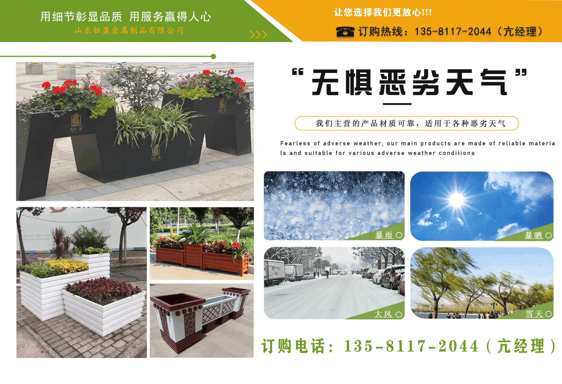 山東鈺盈金屬制品有限公司主營鍍鋅板花箱,道路隔斷花箱,定制花箱,戶外道路花箱,花箱座椅等產(chǎn)品,產(chǎn)品結(jié)構(gòu)合理、性能優(yōu)良,具有強(qiáng)度高、耐腐蝕、抗老化、隔熱隔音、節(jié)約能源、外形美觀、使用壽命長等優(yōu)點(diǎn),深受國內(nèi)外客戶認(rèn)可?! ∥覀兏鶕?jù)客戶所在城市的文化特征,制造出符合當(dāng)?shù)爻鞘形幕瘹庀⒌淖匀涣Ⅲw、觀賞性強(qiáng)的花箱產(chǎn)品成為城市里一道靚麗的風(fēng)景線。 公司實(shí)行誠實(shí)、公正、守信、價(jià)格合理、平等互利?! 」緫{借雄厚經(jīng)驗(yàn)實(shí)力,恪守誠信為本的原則,得到了眾多客戶的信賴,并在業(yè)界獲得良好的口碑。建立了穩(wěn)固的合作關(guān)系,隨著業(yè)務(wù)的不斷發(fā)展和壯大,合作伙伴的范圍也在不斷擴(kuò)大。我們熱情盼望與您的合作,為社會的可持續(xù)發(fā)展獻(xiàn)上一份努力。...